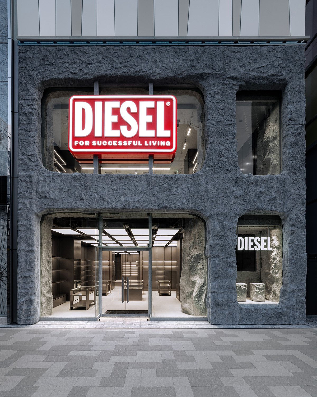 2フロアからなる店舗は、迫力あるポップコーン・コンクリートのファサードと、巨大なディーゼルのアイコニックな“ビスコットロゴ”が象徴的な存在感を放ちます。この大胆な外観はブランドの力強いビジュアルランゲージを体現し、訪れる人々の視線を惹きつけ、ディーゼルの世界へと誘います。