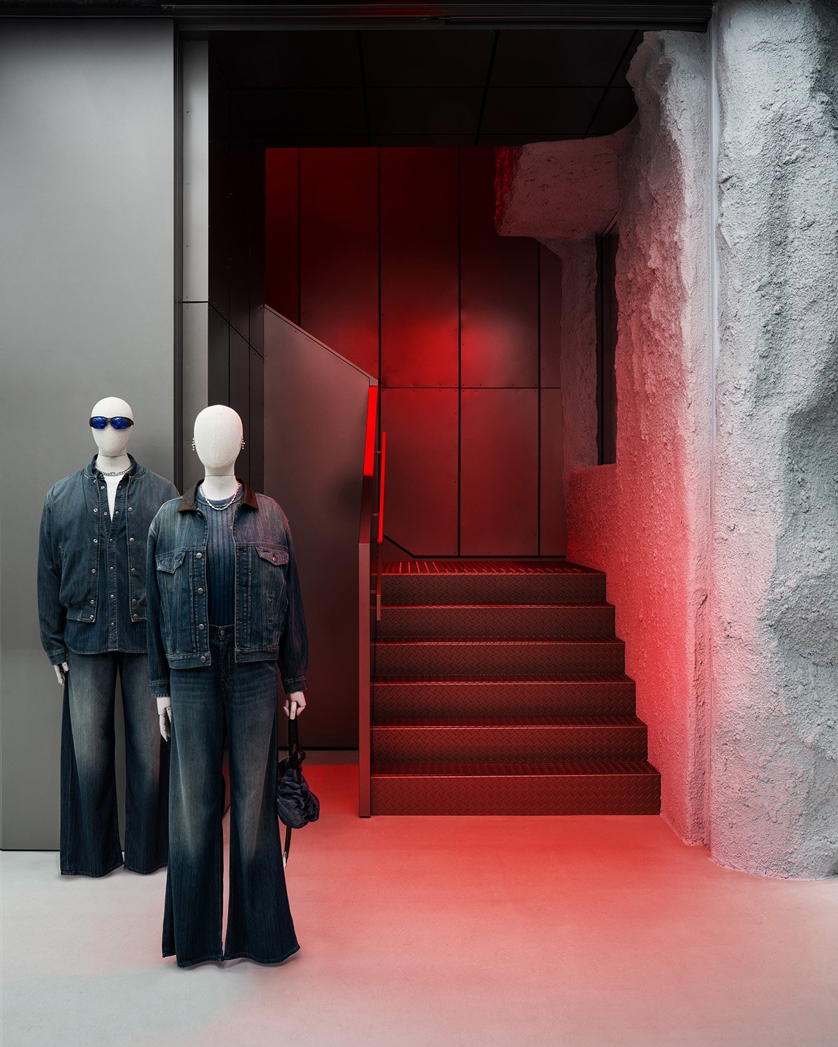 店内は、ブランドの反骨精神を反映したインダストリアルな素材使いで構成され、メタルボードで覆われた壁面がグラフィッカルな背景を生み出します。赤い照明で照らされた階段は空間の中心的な存在となり、来訪者を店内へと導きます。